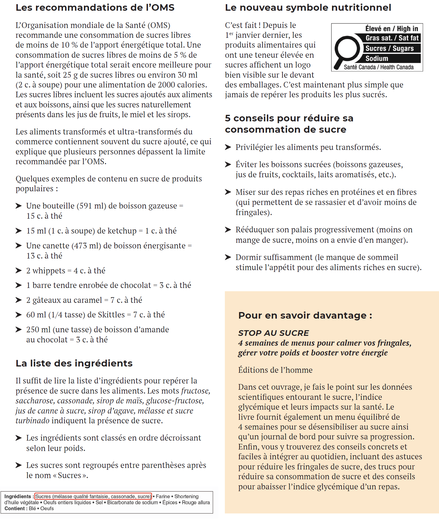 Ce n’est pas un secret, le sucre est omniprésent dans notre alimentation moderne. Lorsqu’il est consommé en excès, il est associé à plusieurs maladies chroniques, dont le diabète de type 2, les maladies cardiovasculaires et l’obésité. Une consommation élevée peut aussi favoriser les fringales, lesquelles contribuent à la prise de poids et peuvent affecter le bien-être psychologique. En prime, le sucre nuit à notre niveau d’énergie en déstabilisant notre glycémie. C’est pourquoi la réduction des sucres ajoutés fait consensus auprès de nombreux organismes de santé publique. Mieux comprendre le sucre, ce glucide souvent mal aimé, permet de faire des choix plus éclairés au quotidien.